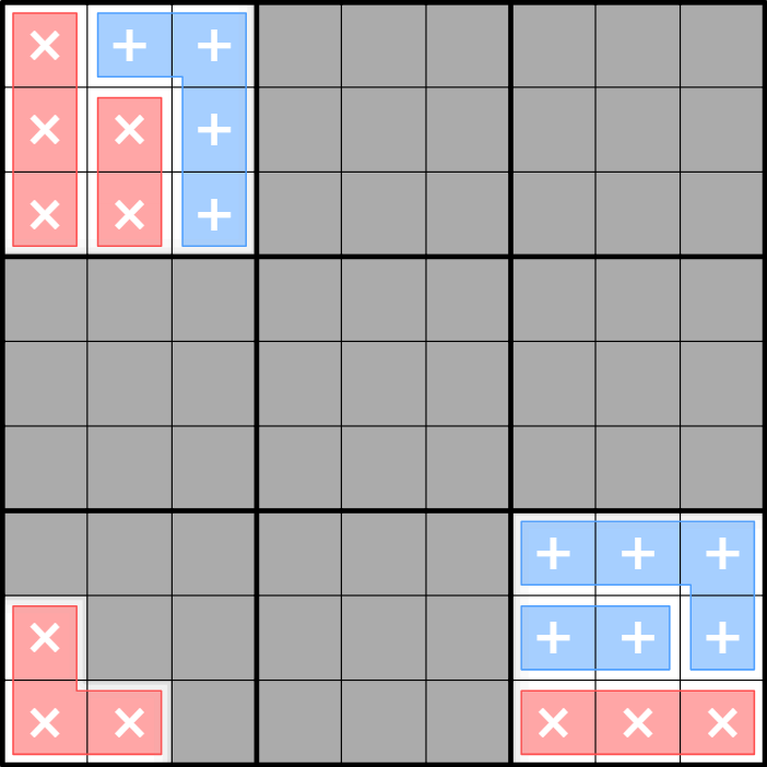 Gleichwertige Summe/Produkt-Käfige: Alle blauen Käfige (“+”) haben die gleiche SUMME; alle roten Käfige (“×”) haben das gleiche PRODUKT. Beide Konstanten müssen von Ihnen bestimmt werden. Ziffern dürfen innerhalb eines Käfigs wiederholt werden, falls es die Sudoku-Regeln erlauben.