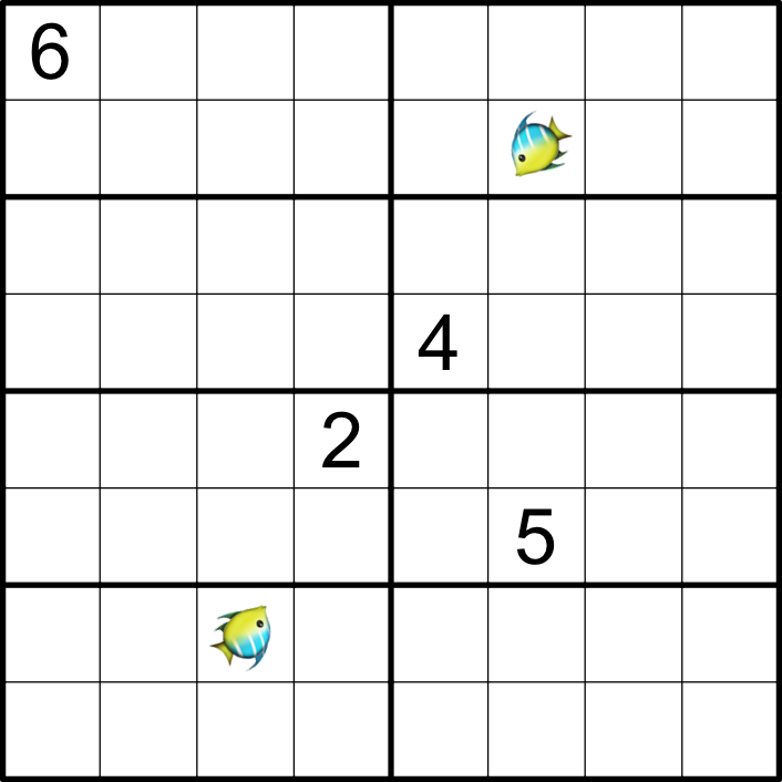 Place the digits 1-7 or a fish in each cell such that no element repeats in a row, column, or box.
