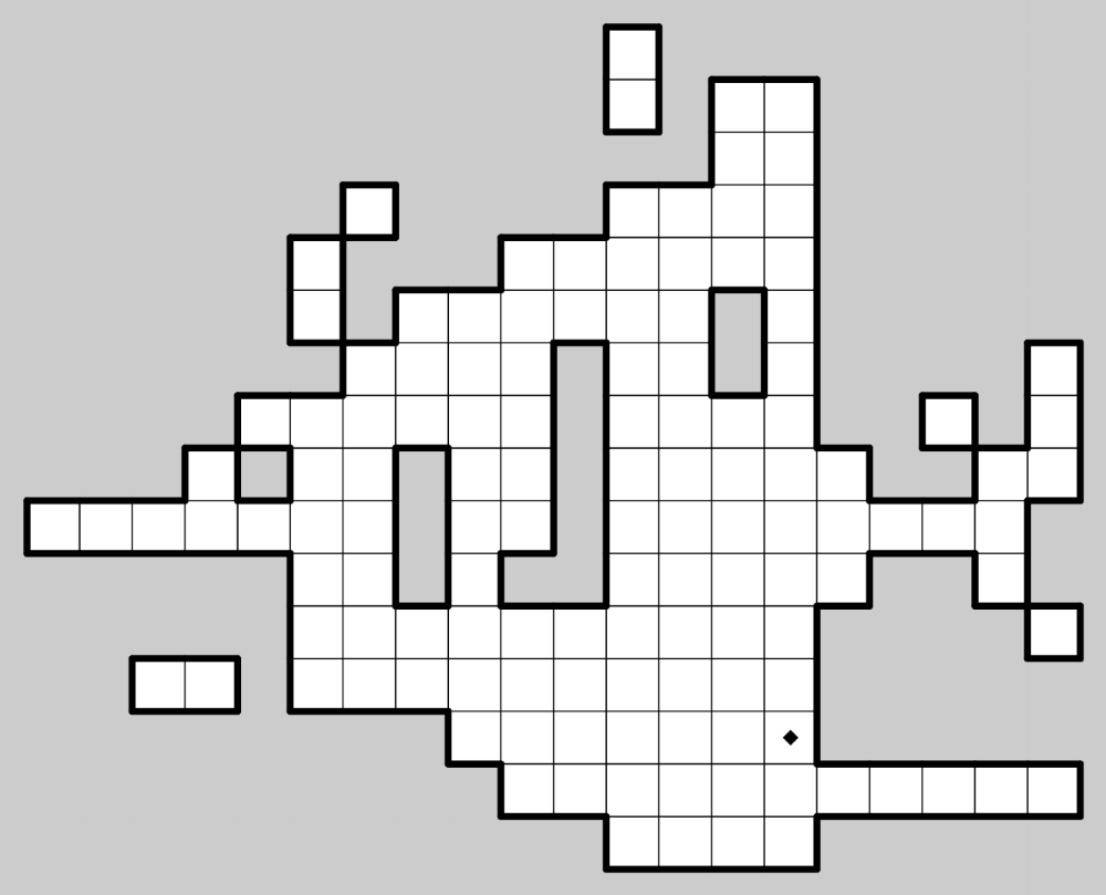 Starting at the black diamond, draw a directed path through the centers of some cells in the grid. Path segments are drawn sequentially from cell to cell, such that the first path segment is drawn from the black diamond to an adjacent empty cell, the second segment is drawn from that cell to the next empty cell, and so on until the final segment is drawn and the path ends.