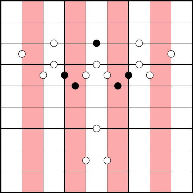 Kropki Pairs: Ein schwarzer Punkt zeigt an, dass die Ziffern in den angrenzenden Zellen im Verhältnis 1:2 stehen. Ein weißer Punkt signalisiert Zahlen mit der Differenz 1. Nicht alle Punkte sind notwendigerweise angegeben.