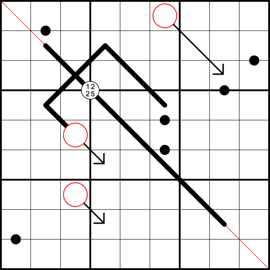 - Negative Diagonal: Digits cannot repeat along the negative diagonal, marked with a thin red line.