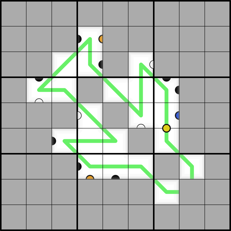 German Whispers: Adjacent digits on a green line must differ by at least 5.