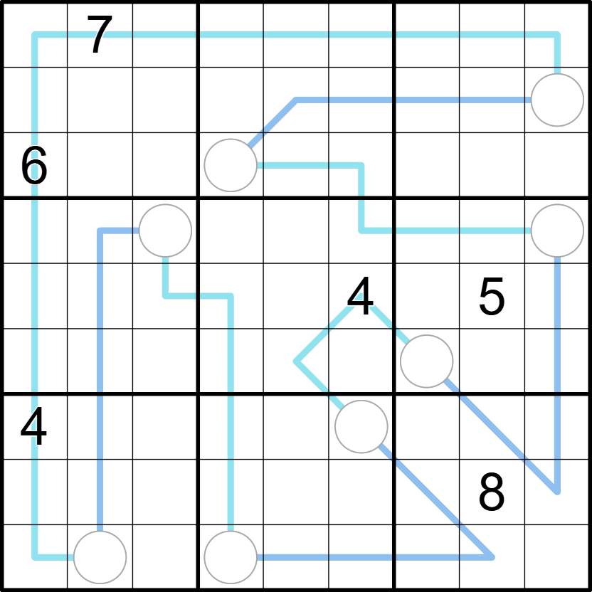 - Doublers: There are 9 Doubler cells in the grid, one in every row, column and region. Every Doubler contains a unique digit.