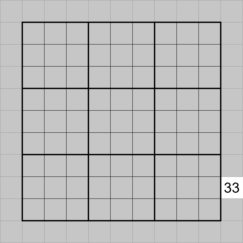 - Sudoku: Fill all rows, columns and marked 3x3 regions in the central 9x9 grid with the digits 1-9 without any repeats.