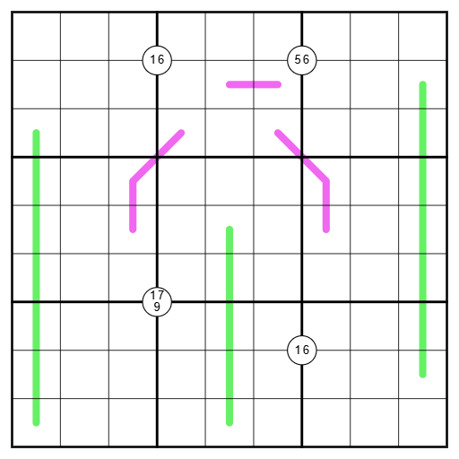 - Purple Renban Lines: Digits on purple lines are a set of consecutive digits, without repeats, in any order.