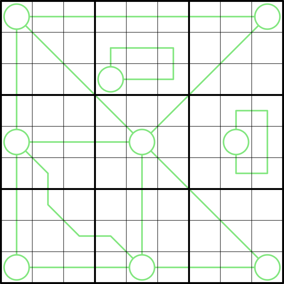 Digits along a green line sum to a number obtained as a concatenation of the two digits in the circles attached to it. A line with a single circle on both ends has a sum equal to the number obtained as the concatenation of two instances of the circled digit.