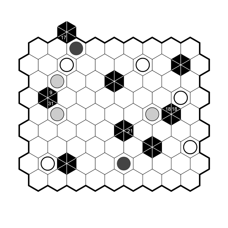 - Die Zahlen in einem schwarzen Sechseck geben die Summe der Ziffern an, die der Hinweis in der angegebenen Richtung bis zum nächsten schwarzen Sechseck oder bis zum Rand des Gitters sieht.