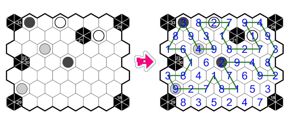 - Hexagonales Kakuro: Platziere eine Ziffer von 1 bis 9 in jedem leeren Feld, sodass sich die Ziffern nicht in einer ununterbrochenen Reihe (entlang einer der drei Richtungen, in denen die Felder Kanten aufweisen) wiederholen, ohne dass schwarze Sechsecke sie trennen.