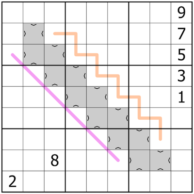 Every set of 3 consecutive cells along the orange "entropic" line must contain a low digit {123}, a middly digit {456}, and a high digit {789}.