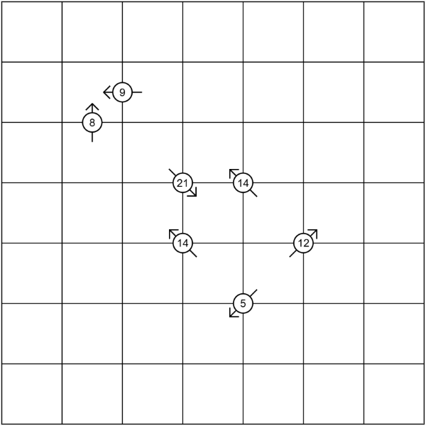 3. Hinweise: Der Wert der Zelle, die N Schritte in Richtung eines Pfeils entfernt ist, wird im zugehörigen Kreis angegeben. N ist die Ziffer in der Zelle, von der aus der Pfeil ausgeht (Beispiel: Wenn r3c3 eine 2 wäre, müsste der Wert von r5c5 21 sein).