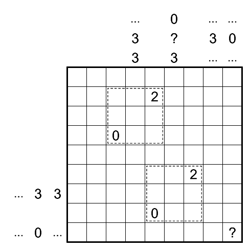 Summation U-Bahn: Draw a loop network through the centers of all unshaded cells, which may branch or turn, but may not have any dead ends. The network may not travel on shaded cells. Assign each line shape (irrespective of rotation) a digit from 1 to 4 as follows: corner = 1, straight line = 2, branch = 3, cross = 4. Clues to the top and left of the grid indicate the sum modulo 4 of "digits" in each contiguous sequence of cells visited by the loop network, in the correct order. Consecutive sequences must be separated by at least one shaded cell. For each row or column, either all clues or no clues are given. '?' may replace any number. '...' replaces 0 or more clues in the position given.