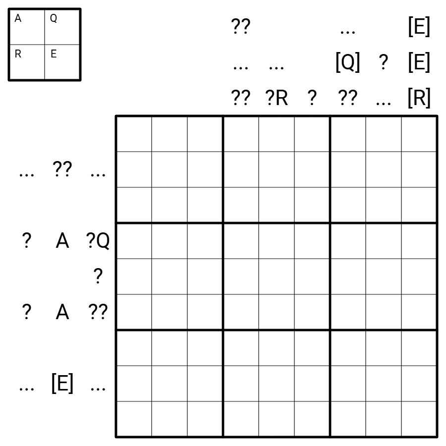 - Aqre: Shade some cells so that all shaded cells form one orthogonally connected area. There may not exist a run of more than three consecutive shaded or unshaded cells horizontally or vertically anywhere in the grid. The digit in the upper-left corner of each box indicates the number of shaded cells in that region.