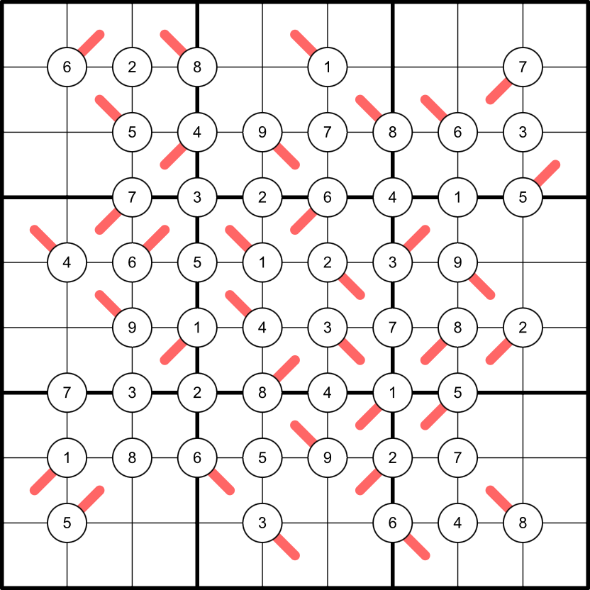 • Digits appearing in quad circles must be placed in at least one of the four surrounding cells.