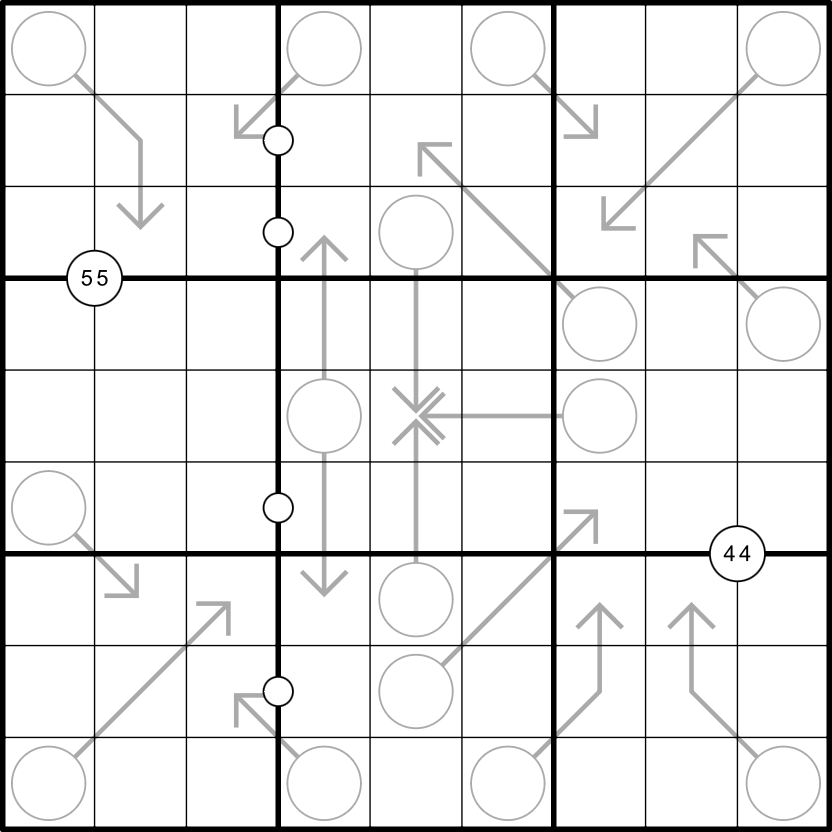 • Digits that appear on a quad circle must appear in the surrounding four cells exactly once each.