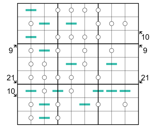 Every three-cell-segment connected by teal lines contains one digit from each of the groups {147}, {258}, and {369}.