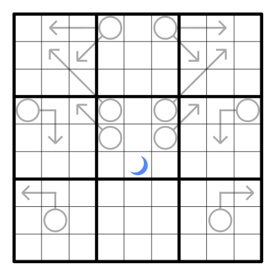 + Two particular cells marked by yellow sun/blue moon symbols in both grids must contain high digits.