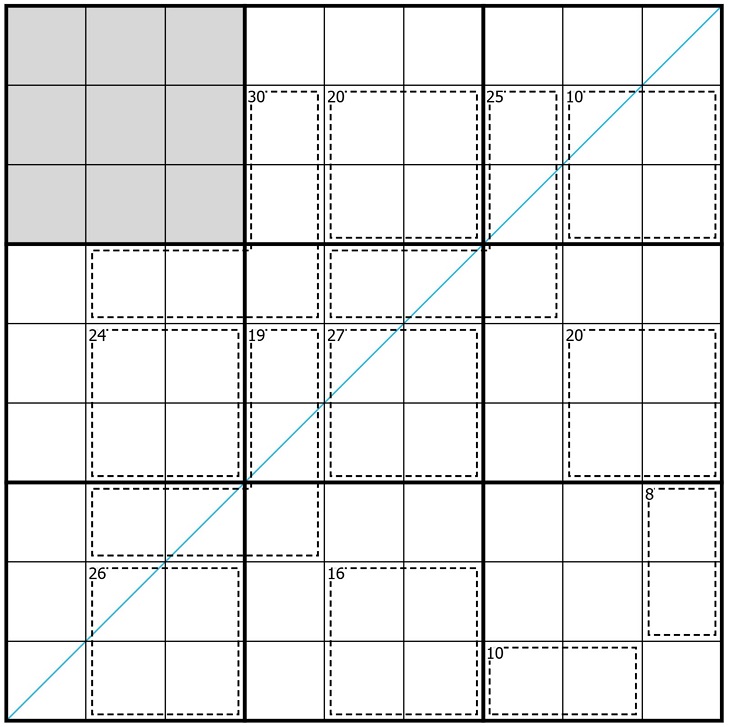 Auf der eingezeichneten Diagonale dürfen sich keine Ziffern wiederholen.