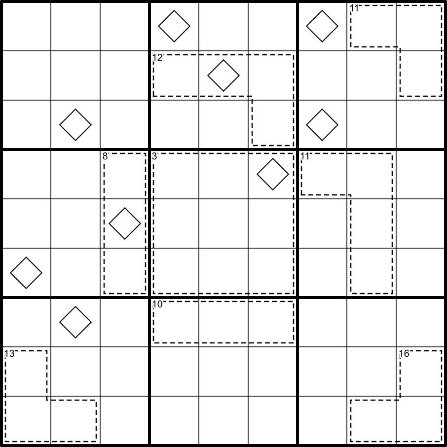 A digit in a diamond is not circled, and equals the sum of the circled digits in its row and column.