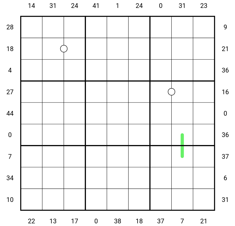 The numbers next to a row or column indicate the sum of the digits along that row or column, starting from the cell closest to the number, up to but not including the colored square on that row or column. However, 4 of the numbers outside the puzzle have been mistyped and are incorrect.