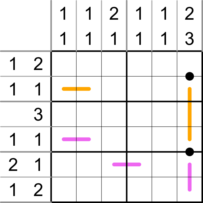 My first puzzle! I was introduced to variant sudokus from a YouTube video recommending Rat Run by Marty Sears. I’ve since solved most of his puzzles and have been inspired to take a shot at making my own. I’m a big picross fan, so I had to find a way to combine it with sudoku. Might make a bigger one in the future if I’m feeling up to the task.