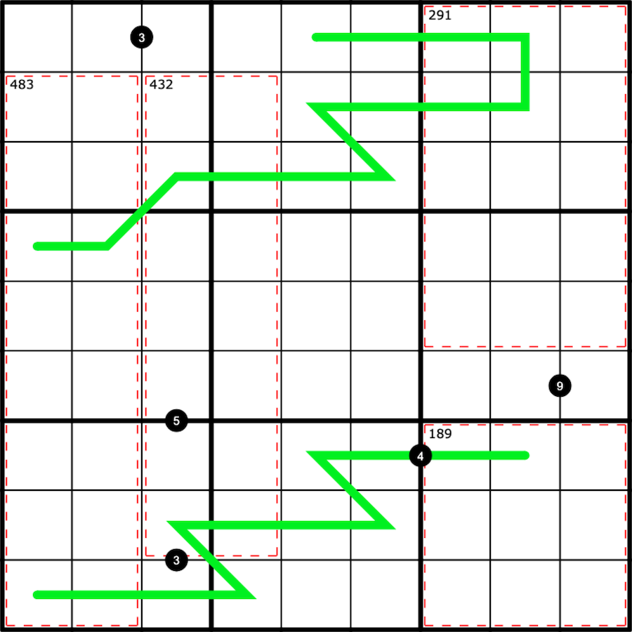 Any Number appearing in a red cage or on a green line must be entirely in the cage or on the line.