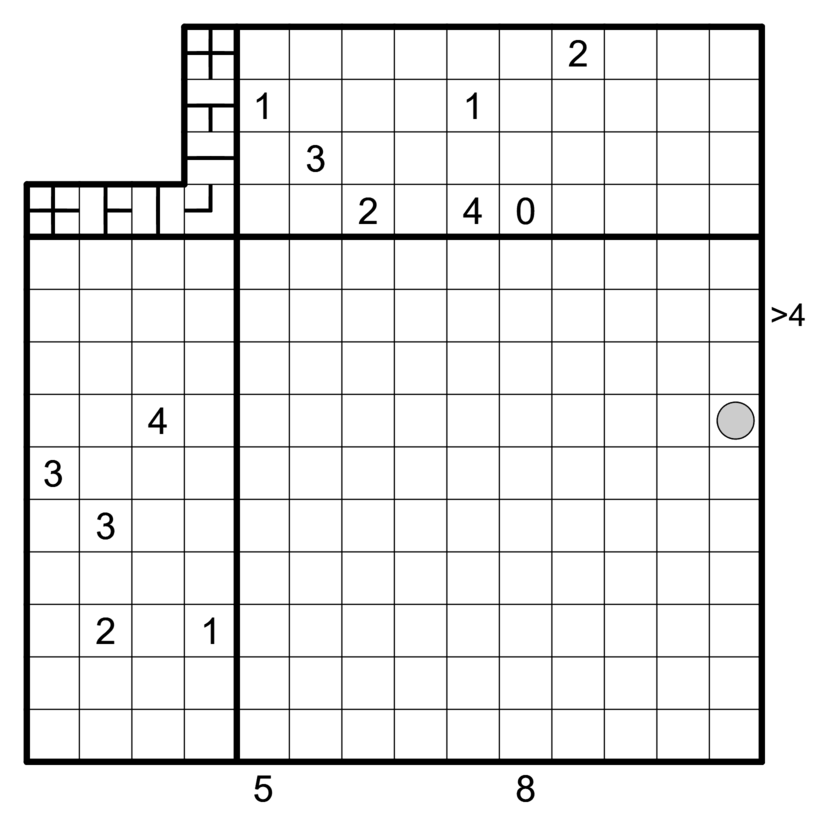 Shade some cells to form a one cell wide snake. The snake may touch itself diagonally but not orthogonally. A grey circle must be shaded. Clues to the right and below the grid indicate how many times shaded cells appear in that row or column.
