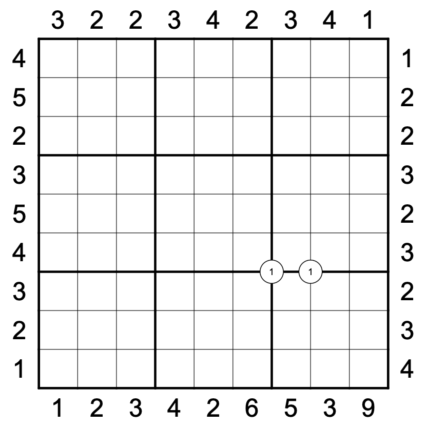 Skyscrapers: skyscrapers are visible when looking from that direction. Digits in the grid represent the heights of the skyscrapers. Taller skyscrapers block the view of any smaller skyscrapers behind them. Clues outside of the grid give the number of skyscrapers visible from that point in that row or column.