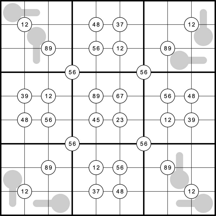 Quadruplets: every digit in a circle must be assigned to one of the four surrounding cells.