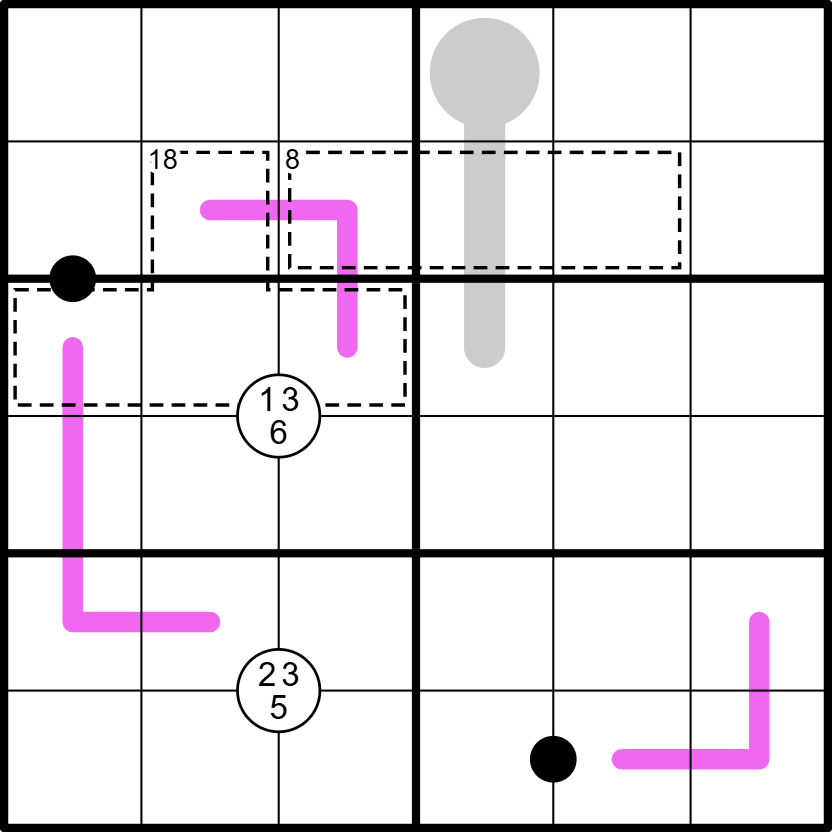 Killerkäfig: Ziffern, die von einem gepunkteten Käfig umgeben sind, müssen die Summe der Zahl oben links in ihrem Käfig ergeben.