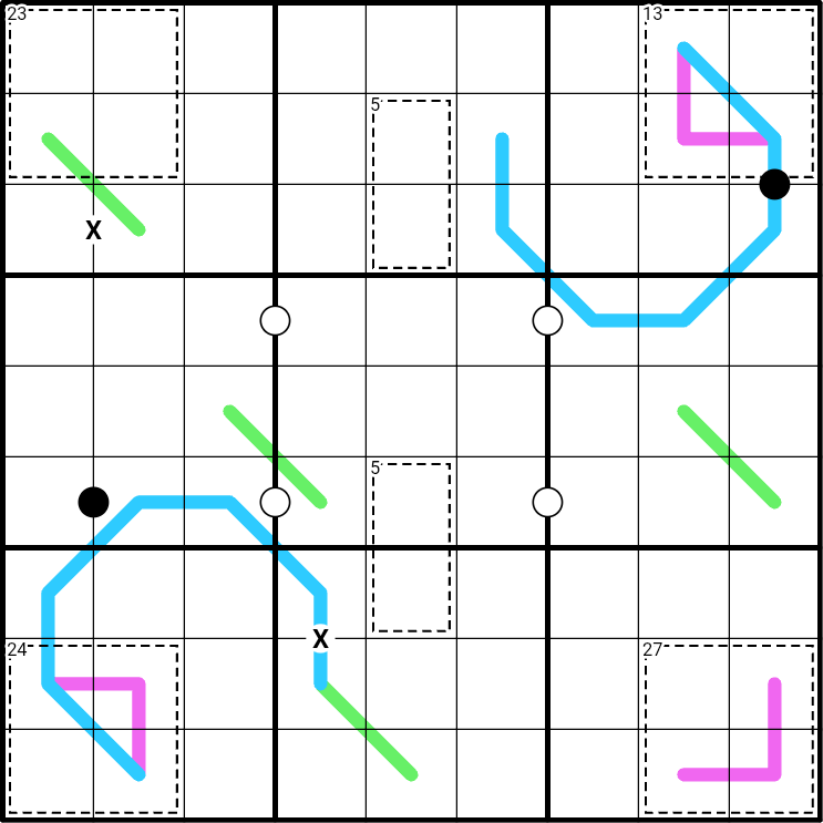 - Unique Renban: The purple Renban line contains a set of consecutive digits in any order. Digits appearing in one Renban line cannot appear in another Renban line.