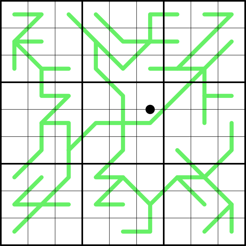 German whispers: adjacent digits on a green line must differ by at least 5.