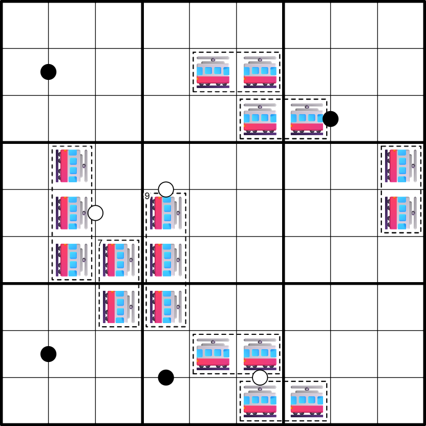 Cages act as trams trying to reach the edge of the grid. Trams can only travel on "roads" that consist of consecutive digits. If the tram is vertical, it can only travel straight up or down. If a tram is horizontal, it can only travel straight left or right. Find the solution such that each tram can reach the edge of the grid on a road. Below is an example with a possible solution for the roads