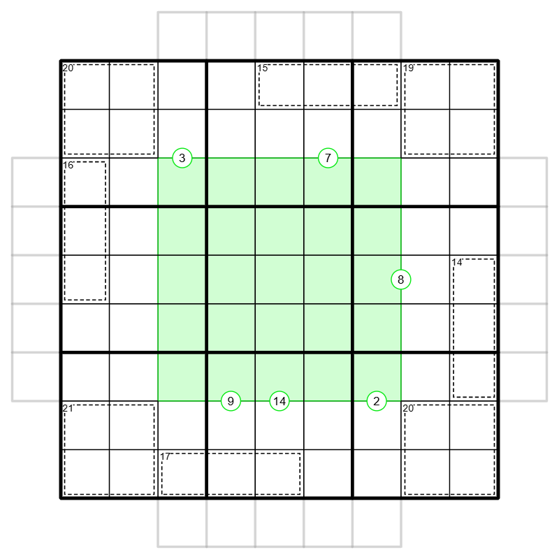 - Numbers in circles on the border of the 5x5 (X) provide the result from subtracting the rank of the corresponding row or column in the indicated direction (R) from the sum of the digits in the 5-digit number (S), meaning X = S - R.