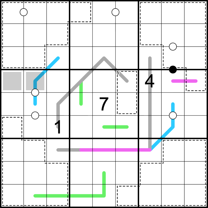 Kropki dots: Digits separated by a black dot must be in a 1:2 ratio. Digits separated by a white dot must be consecutive.