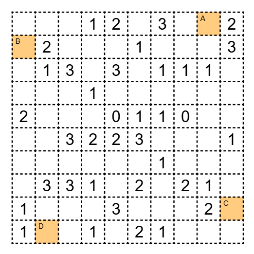 Solution code: Die Größe der Außengebiete im Uhrzeigersinn, beginnend oben links. Für ein Gebiet ab Größe 10 ist statt der Größe ein X einzugeben.