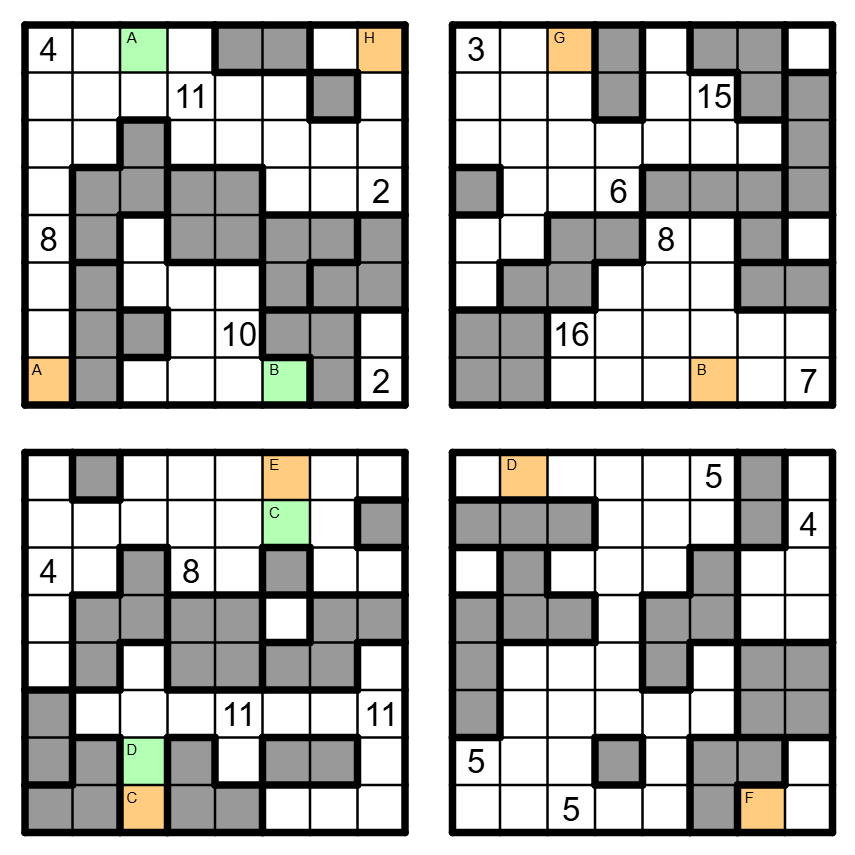Die grau gefärbten Gebiete sind Klon-Gebiete. Identische Gebiete müssen in entsprechenden Feldern den gleichen Inhalt haben, es müssen also entweder beide Felder leer sein oder beide eine Kerze gleicher Höhe enthalten.
