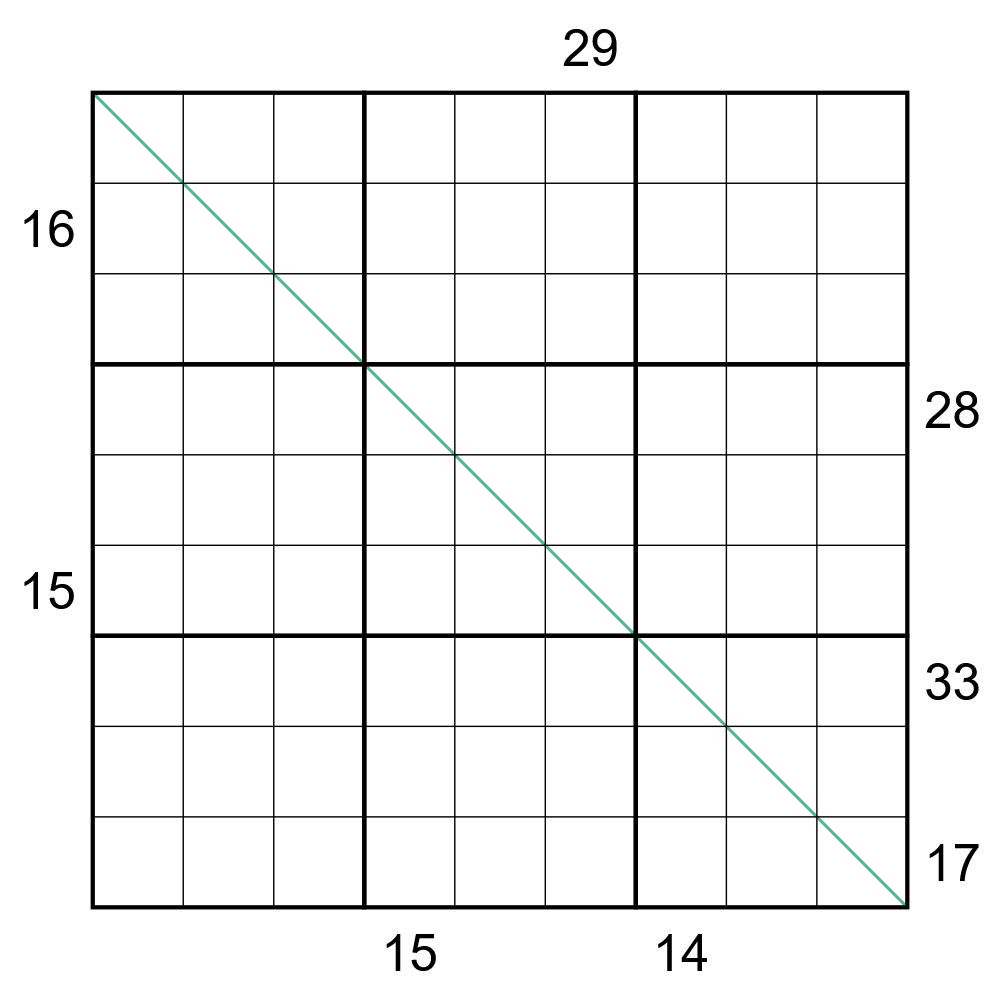 A clue outside the grid is the sum of the first X cells in the corresponding row/column, where X is the digit in the cell nearest to the clue.