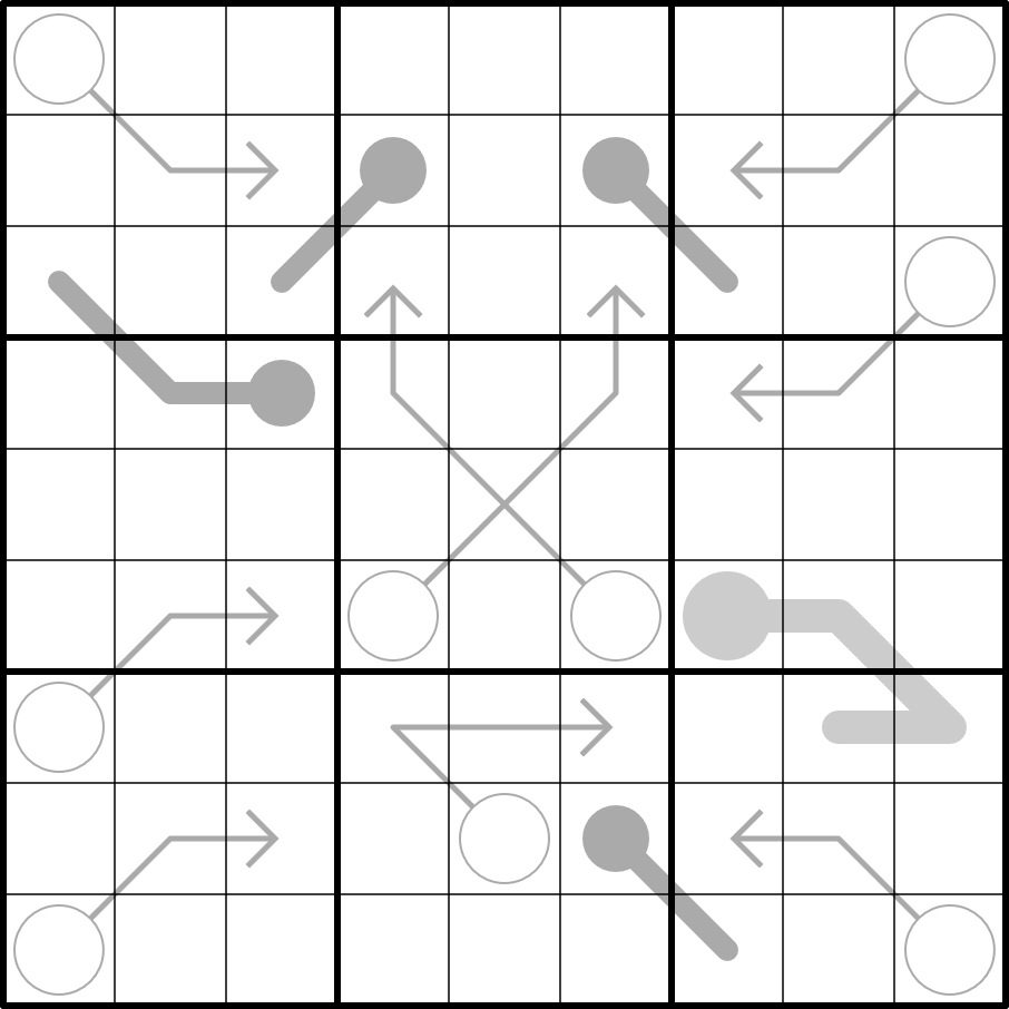 Arrows: Digits along an arrow sum to the digit in the attached circle. Arrows do not turn at intersections.