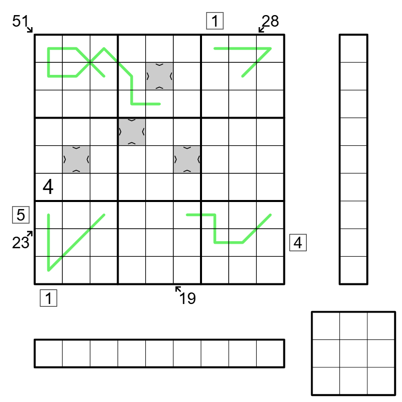 - Clues outside the 9x9 grid in squares are numbered rooms clues. The value in the cell closest to the clue indexes the nearest instance of the clue in the row or column. If the clued value does not appear in the row or column, the index will have a value of 0.