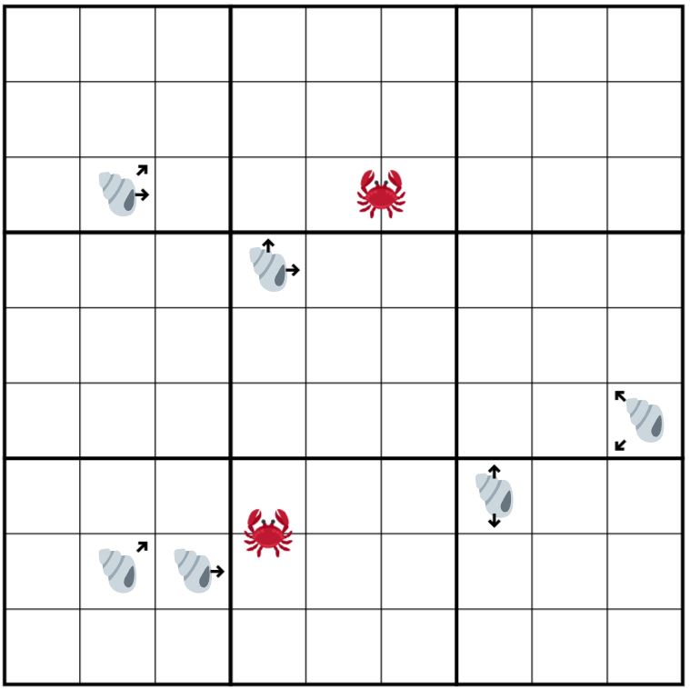 Sea Shells: Sea shells only appear in Sea cells and their digit counts the total number of Sea cells seen in all of its indicated directions combined (not including itself). NB: Sand cells do not block its view.