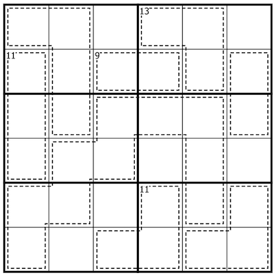 Cages mark "Vaults". Digits in a vault MAY repeat. Digits orthogonally adjacent to a vault may NOT be included within that Vault.