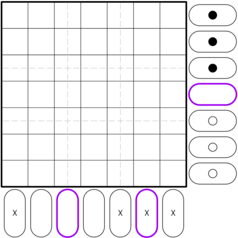 • Thick purple pills are X-sum clues, i.e. the digits missing from that row or column can form a 2-digit number, which is the sum of the first X digits from the direction of the pill, where X is the first digit seen;