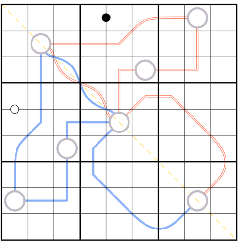 Initial inspiration for the combination came from the excellent puzzle Croma by Nordy and Math Pesto. Their beautiful setup with double arrow between line duality made me want to explore the slightly looser connection that mirrors could offer.