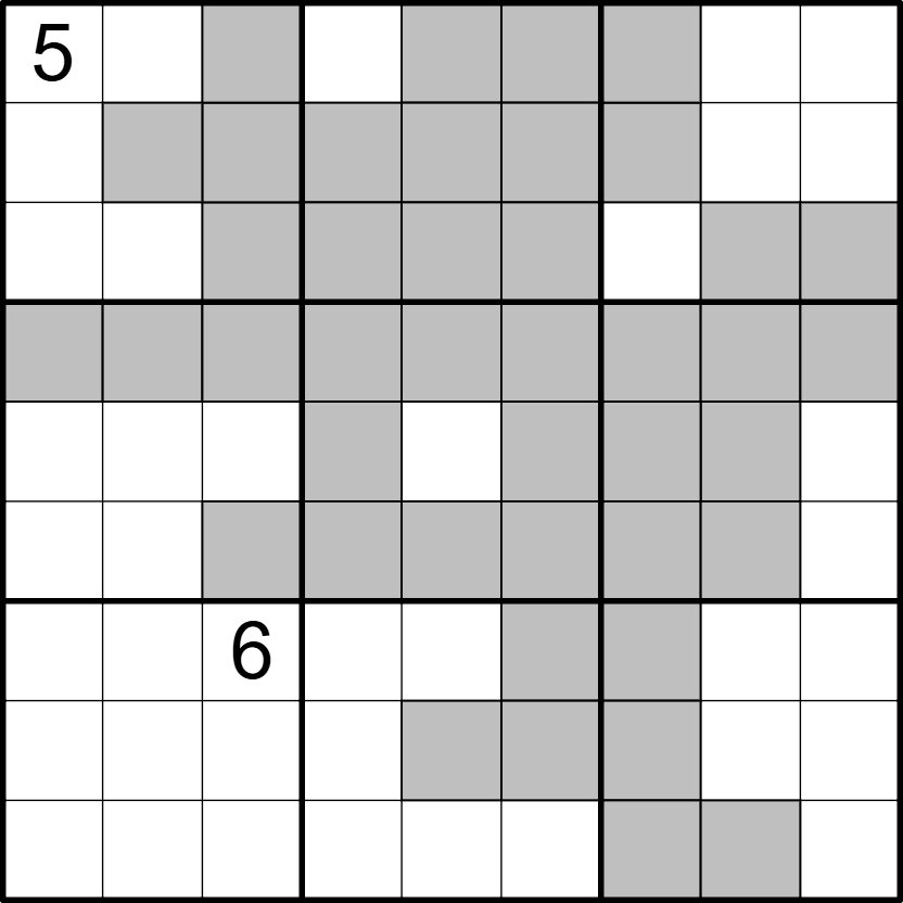 In das Gitter ist ein Berg gezeichnet, dargestellt durch die grauen Kästchen. Der Gipfel ist die Ziffer 9 im zentralen 3x3-Gebiet. Der Berg besteht aus allen Kästchen, die vom Gipfel aus erreicht werden können, indem man sich zu horizontal oder vertikal benachbarten Kästchen bewegt,