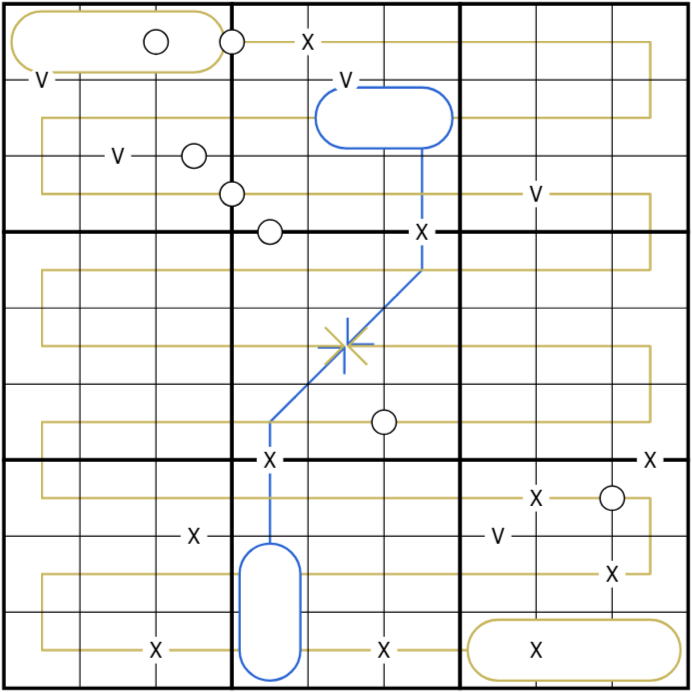 Digits in cells joined by an X sum to 10. Digits in cells joined by a V sum to 5.