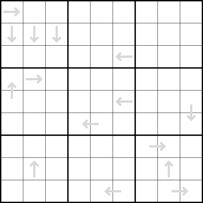 A one- or two-digit number on an arrow within a row or column indicates the rank of that row or column when both the rank and the entire row or column are read in the direction indicated by the arrow. For example, if R6C4 = 4 and R6C5 = 2, then row 6, when read from right to left, has rank 24.
