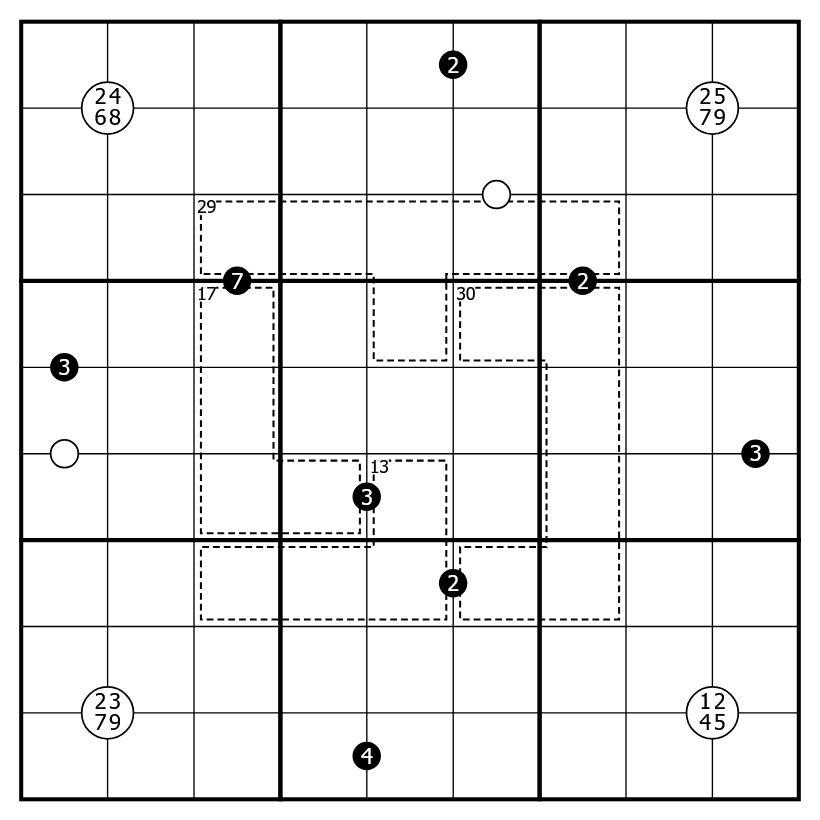 Digits appearing in large circles (on grid intersections) must appear in the surrounding four cells.