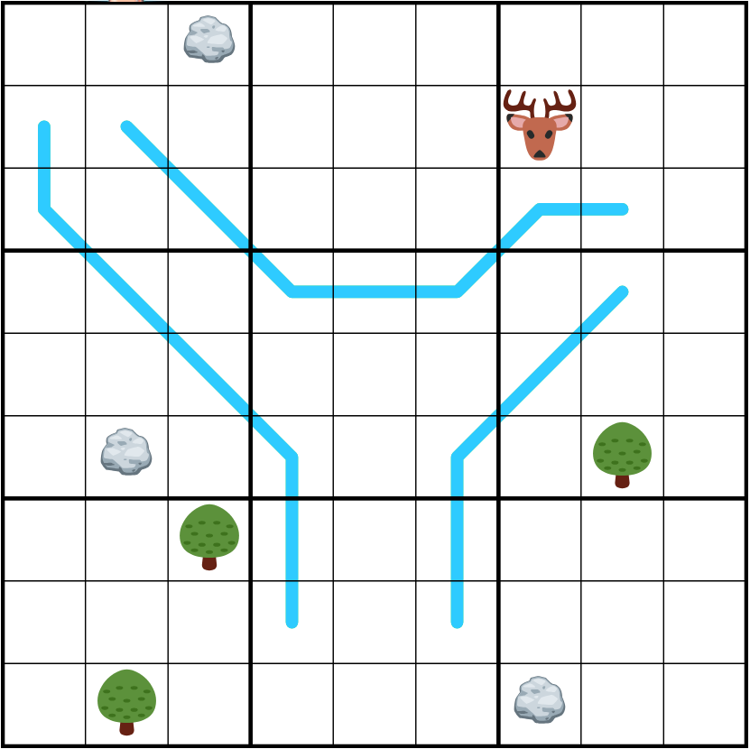 2. RIVER: The river works as both a Region Sum Line and a German Whisper Line. Box borders divide the blue lines into segments which all have the same sum (different lines may have different sums). Adjacent digits on the lines must differ by at least 5.