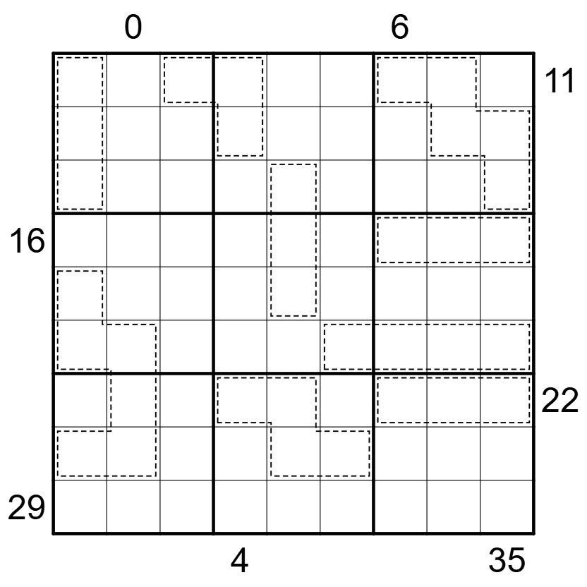 Sandwich: A clue outside the grid gives the sum of the digits appearing between the 1 and the 9 in that row/column.