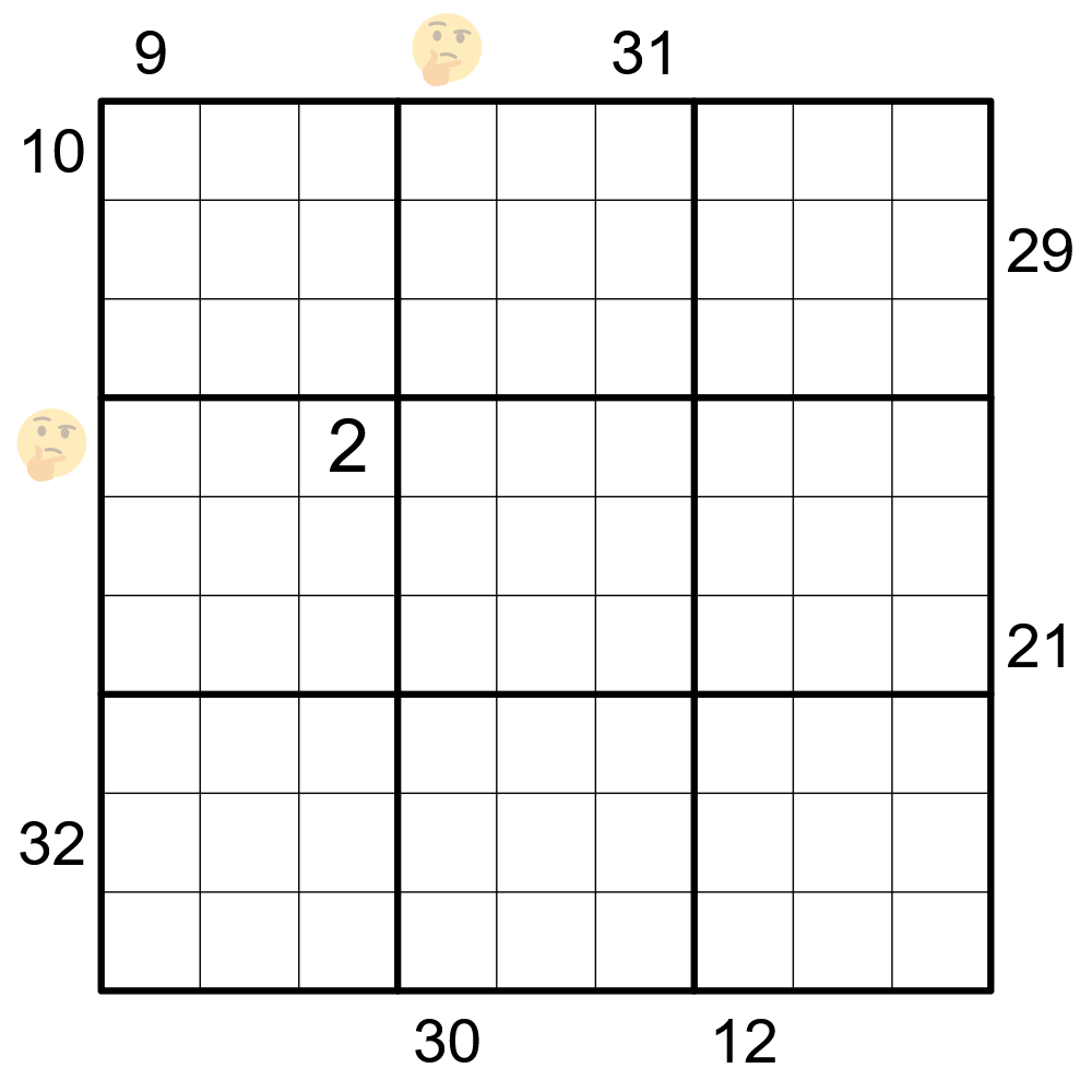 - Clues outside the grid also indicate the sum of the first and every Nth value after it in the row or column, where N is the digit in the first cell seen from the clue.